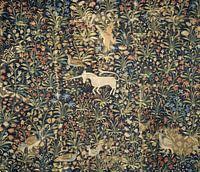 Millefleur (een patroon van bloemen en bladeren) wandtapijt, met een eenhoorn. Toen dit wandtapijt ongeveer 500 jaar geleden werd geweven, geloofden veel Europeanen dat eenhoorns echte dieren waren. In de late middeleeuwen (rond 1300-1500) beeldden kunstenaars eenhoorns af als zuiver witte paardachtige wezens met een lange, gedraaide hoorn. Eenhoorns zouden sierlijk en ongrijpbaar zijn, en hun magische hoorns zouden genezende krachten hebben.