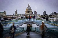 De foto toont de Millenium Bridge kort voor zonsondergang.