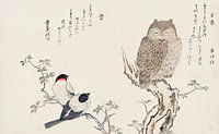 Mimizuku Uso van Utamaro Kitagawa (1753-1806), een traditionele Japanse ukiyo-e stijl illustratie van goudvink en gehoornde uil vogels en een Japans gedicht geschreven op beide zijden van de pagina's.