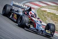 Minardi Formule 1 racewagen in een bocht op het circuit van Zandvoort. De Minardi PS02 nam in 2002 deel aan het FIA Formule 1-kampioenschap. Beeld met bewegingsonscherpte.