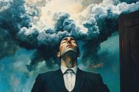 Mind Gate - Dit mannen schilderij toont een persoon in een donker kostuum, met z'n hoofd achterover, omringd door een uitgestrekt landschap van dichte, tumultueuze wolken die door een poort lijken te zweven, wat een krachtige en surrealistische atmosfeer creëert.