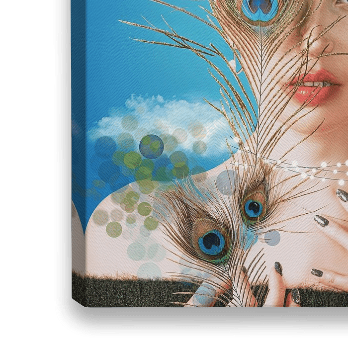 Mind's eye; een dromerig, prachtig en uniek ontwerp van een vrouw met pauwenveren, wolken en een vlucht vogels.
