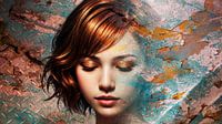 A.I. art portret gemixed met fotografie en design. Een vrouw met korte oranje haren, ze heeft haar ogen dicht en straalt rust uit ,gecombineerd met juist ruige texturen van verroest metaal. Het idee erachter is, hoe blijf je rustig in een wereld waar er zoveel om je heen gebeurd?...juist Mindfulness :)