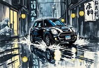 In deze expressieve sumi-e interpretatie barst de Mini Cooper uit een storm van zwarte inkt en spetters, die energie en vrijheid belichamen. Het penseelwerk is ongetemd - gedurfde bogen en dynamische druppels suggereren snelheid en passie, alsof de auto door zowel mist als herinnering snijdt. De kunstenaar gebruikt zowel leegte als inkt en creëert een balans tussen beweging en ruimte die poëtisch en rauw aanvoelt.