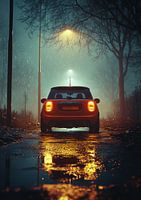 De mini Cooper werd van achteren op de camera vastgelegd met een reflectie van een plas water, die nog mooier werd door het gele licht van boven.