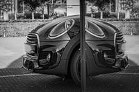 Reflectie van de neus van een mini auto in het glas van de showroom leidt tot een potsierlijk beeld.