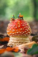 Macrofoto van een mooie rode paddenstoel met een zachte achtergrond.