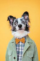 Een schattige miniatuur Ame, gekleed in een stijlvol mintgroen jasje en met een vrolijk gestrikt strikje, trekt ieders aandacht. Met zijn kenmerkende zwart-witte gelaatstrekken en grote, alerte ogen straalt hij een charmante intelligentie en een vleugje speelsheid uit, terwijl de felgele achtergrond zorgt voor een warme, vrolijke en gezellige sfeer.