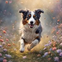 Miniatuur Amerikaanse herdershond spelend in een bloemenveld van Johannas Art Creations