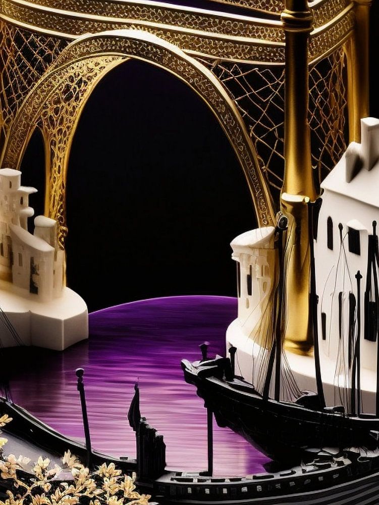 De elegante en fantasierijke scène toont gestileerde miniatuurgebouwen en boten in een geraffineerd kleurenpalet van zwart, wit en goud, verlicht tegen een dieppaarse achtergrond. Een sierlijke gouden boog overspant het tafereel. Twee slanke, zwarte boten met gouden bloemdecoraties liggen op een glanzend violet oppervlak dat het licht weerkaatst. Witte, kasteelachtige gebouwen met spitse torens flankeren de boog. De compositie oogt kalm en sprookjesachtig, met een vleugje theatraliteit door de dramatische belichting en ongewone vormen.