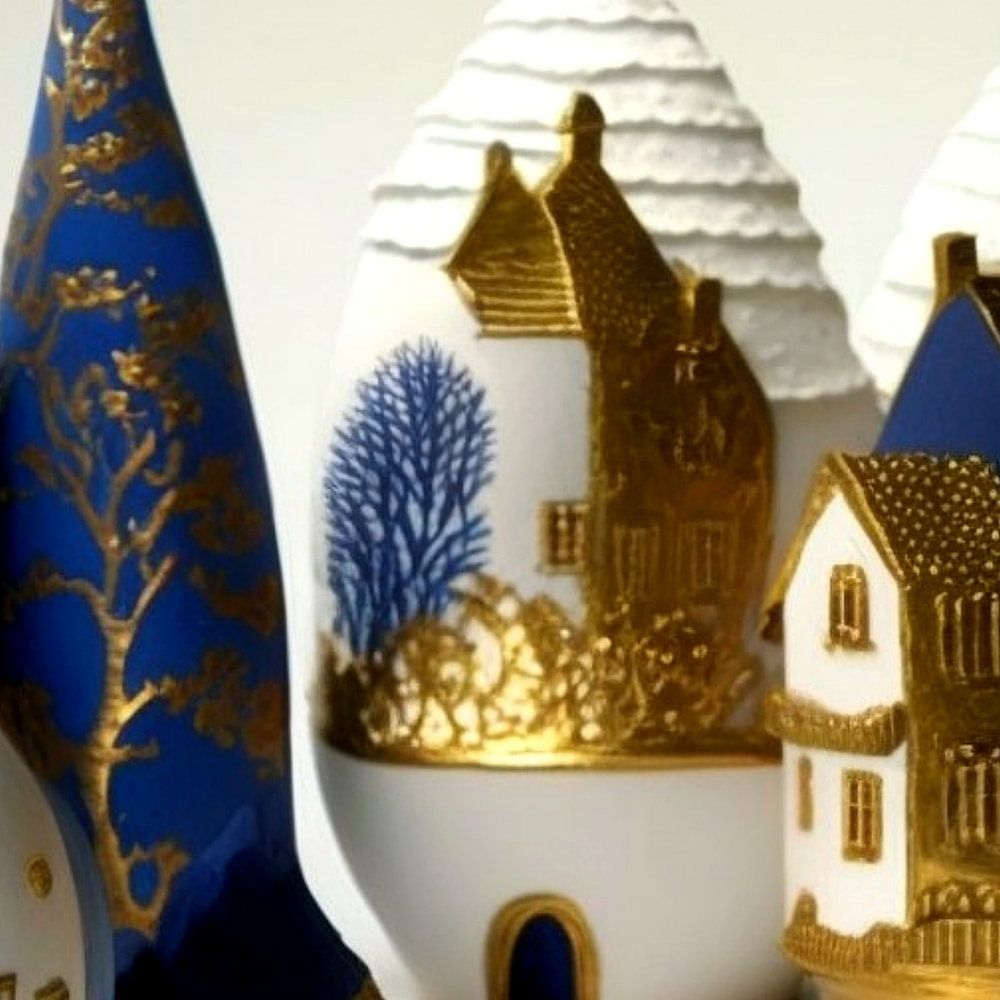 Het charmante en sculpturale porseleinen tafereel bestaat uit een verzameling gestileerde huizen van keramiek in een harmonieus kleurenpalet van wit, blauw en goud. De huizen zijn er in verschillende vormen en maten, sommige met puntdaken, andere met ronde of bijenkorfachtige toppen. Gouden accenten in de vorm van daken, ramen en afbeeldingen van bomen geven de huizen een elegant tintje. De blauwe vlakken hebben zachte kleurovergangen. De compositie is speels en decoratief, met een sprookjesachtige uitstraling.
