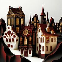 Het fantasierijke en gedetailleerde kunstwerk presenteert een verzameling gestileerde huizen met ongewone architectuur in een warm kleurenpalet van rode, gouden, zwarte en witte tinten. De huizen hebben speelse details zoals spiraalvormige decoraties, gotische ramen en puntdaken. De compositie is sprookjesachtig en uitnodigend, met een vleugje Victoriaanse of steampunk esthetiek. De huizen lijken ingebed in een zacht, heuvelachtig landschap.