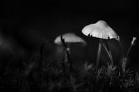 Ik heb deze macrofoto gemaakt in de Leuvenumse bos op de Veluwe, deze paddenstoelen stonden pal langs een pad op een boomstronk. Om deze foto te kunnen maken heb ik mijn camera op statief gezet om zo weinig mogelijk beweging te krijgen. Bij het maken van de foto had ik geluk dat er een zonnestraal door het bladerdek op een paddenstoel viel. Ik heb ervoor gekozen om deze macrofoto achteraf om te zetten in zwart-wit, het geeft wel een bepaalde sfeer aan de foto. Om welke paddenstoelen het gaat weet ik eigenlijk niet. Zoals je kan zien staan deze paddenstoelen tussen het mos.