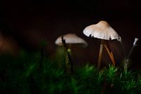Ik heb deze foto gemaakt in de Leuvenumse bos in de gemeente Ermelo. Dit plaatje zag ik gewoon langs een pad waar ook wandelroutes overheen gaan. Je moet het wel zien natuurlijk. Ik vond de compositie mooi om vast te leggen. Toen ik mijn camera op statief had gezet en in had gesteld viel er net de zon door de bladerdek precies op deze paddenstoel waardoor een deze sfeer ontstaat. Ik weet alleen niet om welke paddenstoelensoort het gaat, het is een paddenstoeltje van een paar centimeter groot. Het groen wat je ziet is van mos dat om deze paddenstoeltjes ligt, ik weet alleen niet om wat voor een mos soort het gaat. Om te zorgen dat er geen trillingen in mij statief komt heb ik een afstandsbediening gebruikt, ik had ook een 85mm macrolens op mijn camera zitten. Ik heb voor gekozen om de paddenstoel goed belichten waardoor de rest donkerder word, lichtmeter van de camera stond op spotmeting. De rust en de sfeer van deze foto vind ik mooi voor aan de muur, het zal in elke ruimte van je huis passen. Op groot formaat is deze foto om zijn mooist ook al is het een macrofoto.