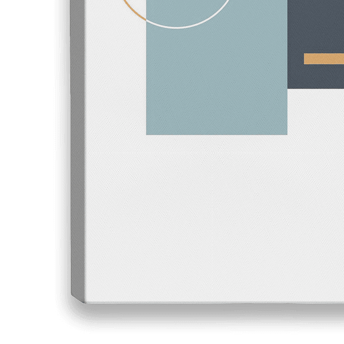 Minimalistische en geometrische print met blauwe vlakken, een goudkleurige cirkel en een goudkleurige dikke lijn. Een mooie abstracte, geometrische print voor iedereen die van moderne, abstracte kunst houdt.