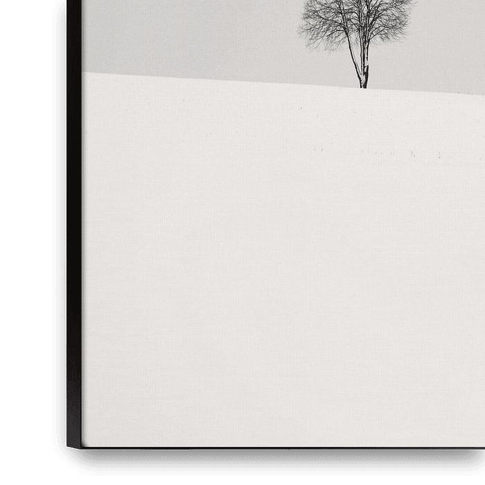 Foto einer winterlichen Landschaft mit zwei Bäumen im minimalistischen Stil in Schwarz-Weiß.