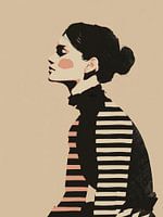Een minimalistisch portret van een vrouw in profiel, weergegeven in zachte tinten en gestreepte patronen. Het kunstwerk mengt elegantie en eenvoud, en legt een stille kracht vast in een modern ontwerp.