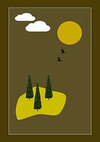 Dit minimalistische werk in pastelkleuren toont een eilandje met 3 boompjes in een groen kader. Twee witte wolkjes, twee silhouetten van vogels en de zon complementeren dit werk. De omlijsting is bruin gehouden en om het groene kader loopt rondom een dunne witte lijn. dit is mijn eerste minimalistische werk is met behulp van een voor…