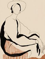 Minimalistisch en stijlvol: dit lijnportret vangt de essentie van elegantie in slechts enkele krachtige penseelstreken. De combinatie van zachte aardetinten, grafische zwarte lijnen en de subtiele aanwezigheid van mode-elementen zoals hoed en oorbellen geeft het werk een tijdloze allure. Perfect voor wie houdt van eenvoud, design en een vleugje Parijse chic in huis.