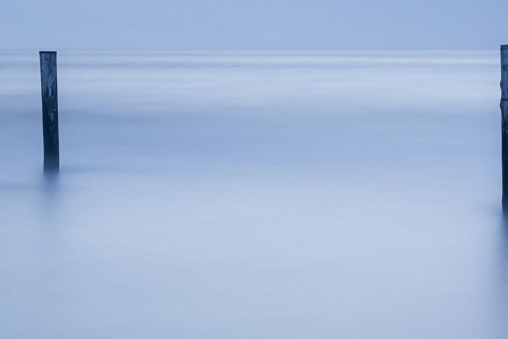 Een opname met een lange sluitertijd tijdens zonsondergang bij de palen van petten. Een kunstwerk wat laat zien waar het voormalige petten lag. Door stormen verdween het oude Petten in zee.