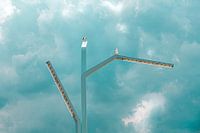 twee meeuwen zitten op een moderne lantaarnpaal met dreigende wolken op de achtergrond. Gemaakt op de boulevard van Scheveningen