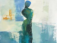 Minimalistisch Abstract Vrouw in Kleuren - Op dit abstract schilderij zie je een vrouwelijke figuur in een zomerse kleurstelling van groen en blauw, met een speelse lichtheid die het minimalistische ontwerp accentueert.