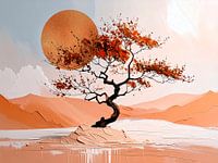 Japandi berglandschap met een elegante, typisch Japanse boom met bloesem.