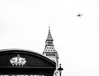 Deze minimalistische zwart-wit foto is gemaakt in London en laat de stad zien zonder haar volledig prijs te geven. Iconische elementen zoals een klassieke Britse telefooncel, de contouren van Big Ben, een straatlantaarn en een passerend vliegtuig zijn aanwezig, maar blijven deels buiten beeld.