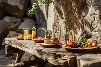 Geniet van een moderne maaltijd in minimalistische stijl. Dit strakke ontwerp met geometrische vormen en monochrome kleuren is perfect voor de hedendaagse eetkamer. De compositie van het servies op tafel creëert een gevoel van rust en harmonie, terwijl de gebruikte kleuren een vleugje elegantie toevoegen.