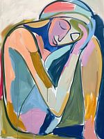 Minimalistisch Vrouw Portret Met Kleur - Op dit abstract portret schilderij zie je een vrouw met een ontspannen houding, gekleed in zachte kleuren zoals blauw, groen en roze, die samen een moderne indruk geven.