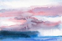 Dit minimalistische abstracte landschap vangt de serene schoonheid van de zee in zachte, romantische aquareltinten. Zachte penseelstreken suggereren de kalme beweging van blauw water onder een lichte lucht in roze, paarse en witte tinten. De eenvoud van de scène zorgt ervoor dat de kleuren en texturen het gevoel oproepen van een stille kustlijn bij zonsopgang of zonsondergang, waardoor het een rustgevend beeld is voor elke ruimte.