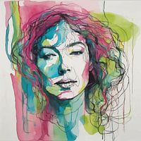 Dit minimalistische schilderij van het gezicht van een vrouw combineert de fijnheid van lijntekeningen met de vloeibaarheid van aquarel, wat resulteert in een portret dat zowel etherisch als expressief aanvoelt. Zachte, vloeiende lijnen omlijnen haar gelaatstrekken met verfijnde eenvoud, terwijl zachte pigmentvlekken diepte en sfeer brengen zonder de compositie te overweldigen. Het contrast tussen precieze contouren en de onvoorspelbare texturen van aquarel creëert een boeiende balans, waar structuur en spontaniteit elkaar ontmoeten. Elke penseelstreek brengt emotie over, waardoor het vrouwenportret tijdloos, sereen en contemplatief lijkt.
