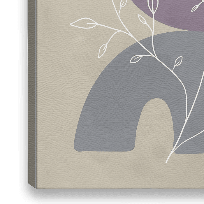 Minimalistisch design met een witte lijntekening van een bladplant, een vorm in blauw-grijs, een vorm in lavendel-paars en een vorm in geel. De vormen en de licht-grijze achtergrond zijn met aquarelverf geschilderd met een zichtbare textuur.