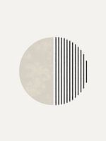 Minimalistisch geometrisch kunstwerk met zwarte lijnen en een ronde vorm in zachte beigetint en texturen en een beige achtergrond.