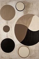Dit moderne, minimalistische kunstwerk is een prachtig voorbeeld van abstracte kunst. Het ontwerp bevat cirkels en segmenten in verschillende bruin- en beige tinten, die samen een harmonieuze en gebalanceerde compositie vormen. Het monochrome kleurenpalet zorgt voor een rustige en serene sfeer, perfect voor moderne interieurs. De geometrische vormen geven het ontwerp een tijdloze uitstraling, waardoor het in verschillende ruimtes kan worden toegepast, zoals de woonkamer of kantoor. Dit stuk is ideaal voor liefhebbers van minimalistische en eigentijdse kunst. Het is subtiel, maar trekt tegelijkertijd de aandacht met zijn speelse contrasten en eenvoudige, doch krachtige vormen. Een perfecte aanvulling op elk interieur dat streeft naar eenvoud en stijl.