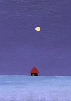 Dit minimalistische schilderij toont een klein zwart huis met een rood dak op een plat, lichtblauw vlak. Een gele maan zweeft boven het huis in de donkerblauwe lucht, die diepte en textuur krijgt door zichtbare penseelstreken. De compositie is gereduceerd, de kleuren zijn beperkt tot blauw, zwart en geel. Het huis lijkt geïsoleerd, wat…