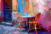 Ben je op zoek naar een stijlvolle en moderne manier om je interieur in te richten? Kijk dan eens naar dit prachtige minimalistische ontwerp met twee stoelen en een tafel tegen een kleurrijke muur. De strakke lijnen en het gebruik van primaire kleuren creëren een gevoel van rust en ruimte. Perfect voor een modern kantoor of woonkamer!