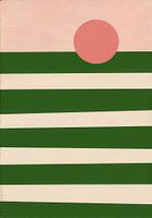 Dit minimalistische ontwerp heeft een abstracte compositie op een rechthoekig, horizontaal formaat. Langs de bovenkant loopt een lichte perzik- of roze band, met daaronder een band van donkergroene, gelijkmatig verdeelde strepen. Daaronder ligt een crèmekleurige band, met een grote, centrale rode cirkel tussen het groen en crème. De…