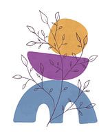 Minimalistisch landschap met een lijntekening van een bladplant en drie organische vormen in geel, paars en blauw, op een witte achtergrond. De vormen zijn met aquarelverf geschilderd met een zichtbare textuur.