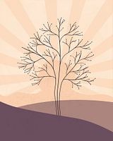 Minimalistisch landschap met een lijntekening van een boom, die tussen twee heuvels staat. Op de achtergrond is de ondergaande zon te zien, met zichtbare zonnestralen. Met uitzondering van de lijntekening, die met inkt gemaakt is, is de illustratie met aquarelverf geschilderd met een zichtbare textuur.