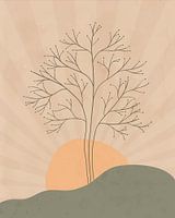 Minimalistisch landschap met een inkt-lijntekening van een boom in donkergroen, met een groene heuvel, een licht oranje zon en retro style zonnestralen in een zalm-kleur. De illustratie is met aquarelverf geschilderd met een zichtbare textuur.