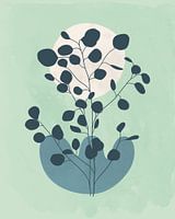 Minimalistisch landschap met een donkerblauwe boom, geïnspireerd van een eucalyptus tak, met twee organische vormen in blauw en heel licht beige. De achtergrond is blauw-groen en net als de twee vormen met aquarelverf geschilderd met zichtbare textuur. De boom is met inkt getekend.