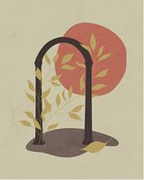 Minimalistisch landschap met een poortboog, een plant met lente-groene bladeren en een rode zon op de licht-grijze achtergrond. De plant is met inkt getekend, de rest van de illustratie is met aquarelverf geschilderd met een zichtbare textuur.