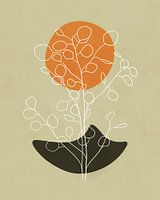 Minimalistisch landschap met een gestileerde eucalyptusboom als witte lijntekening, de zon in oranje, en een organische vorm in donkergroen.