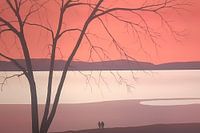 Creëer een oase van rust in je slaapkamer met deze minimalistische print van een kalm meer. De ingetogen kleuren en strakke lijnen zorgen voor een serene sfeer die perfect is om te ontspannen.