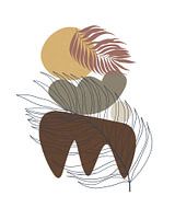 Minimalistisch landschap met twee palmbladeren in terracotta rood en blauw, getekend met ink, en vier organische vormen in bruin, grijs, groen-grijs en gele oker. De vormen zijn geschilderd met aquarelverf met een zichtbare textuur; de achtergrond is wit
