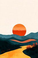Deze prachtige illustratie brengt de rust en schoonheid van een minimalistisch landschap tot leven. Met een warme zonsondergang boven glooiende heuvels en een kronkelend pad, straalt dit ontwerp rust en sereniteit uit. Perfect voor elk interieur dat een warme, moderne touch nodig heeft, zoals een woonkamer, eetkamer of kantoorruimte. Het gebruik van levendige kleuren zoals oranje, geel en blauw maakt het ontwerp dynamisch en aantrekkelijk. Ideaal voor liefhebbers van minimalistische en moderne kunst.
