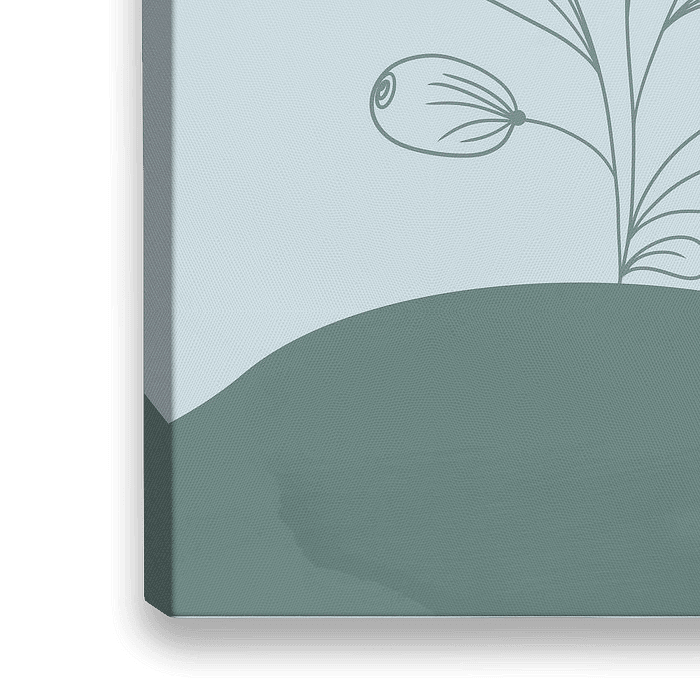 Minimalistisch landschap in de kleuren van een zonsopkomst in de winter: gedekte blauw- en oranje-tinten. Te zien is een plant die tussen heuvels groeit met een zon-vorm op de achtergrond.