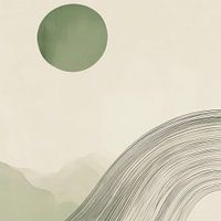 In zachte groene tinten trekt een elegante lijn door het minimalistische landschap, terwijl een zachte, ronde maan erboven zweeft. De harmonieuze compositie straalt rust en sereniteit uit, alsof de natuur gevangen is in een stille dialoog. Het contrast tussen de vloeiende vormen en de heldere hemel creëert een sfeer van tijdloze elegantie.