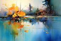 Creëer een oase van rust en kalmte met deze minimalistische print van een meer en een huis. De ingetogen kleuren en strakke lijnen zorgen voor een gevoel van harmonie en balans. Perfect voor de woonkamer, slaapkamer of kantoor.